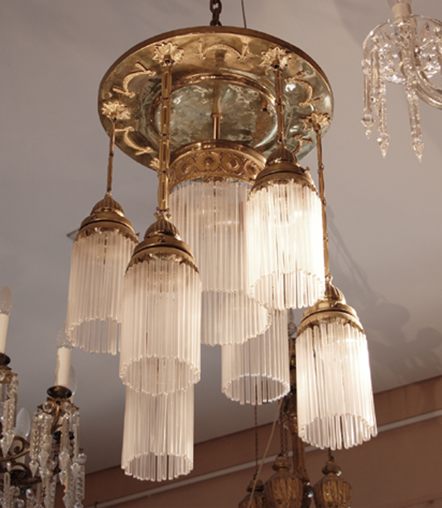 Material: Latón dorado y cristal de macarrones Tema: Lámpara Escuela: Modernista Epoca: primer tercio del siglo XX Estado de Conservación: Perfecto Más Información