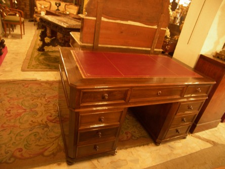 Material: Nogal Pino Meli y piel Tema: Mesa de despacho. Escuela: Isabelina de la época Epoca: Siglo XIX. Estado de Conservación: Perfecto Más Información