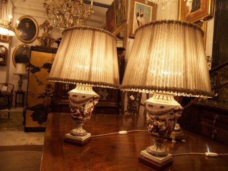 Material: Porcelana de Capodimonte Tema: pareja de lámparas de sobremesa Escuela: Italiana Epoca: S. XIX Estado de Conservación: Perfecto Más Información